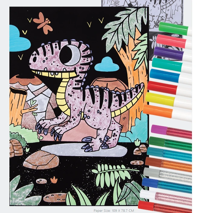 Kreatívna súprava obsahuje jednu veľkú zamatovú omaľovánku o veľkosti 57 × 35 cm, 8 zmývateľných fixiek a 8 trblietavých gélov v tube.