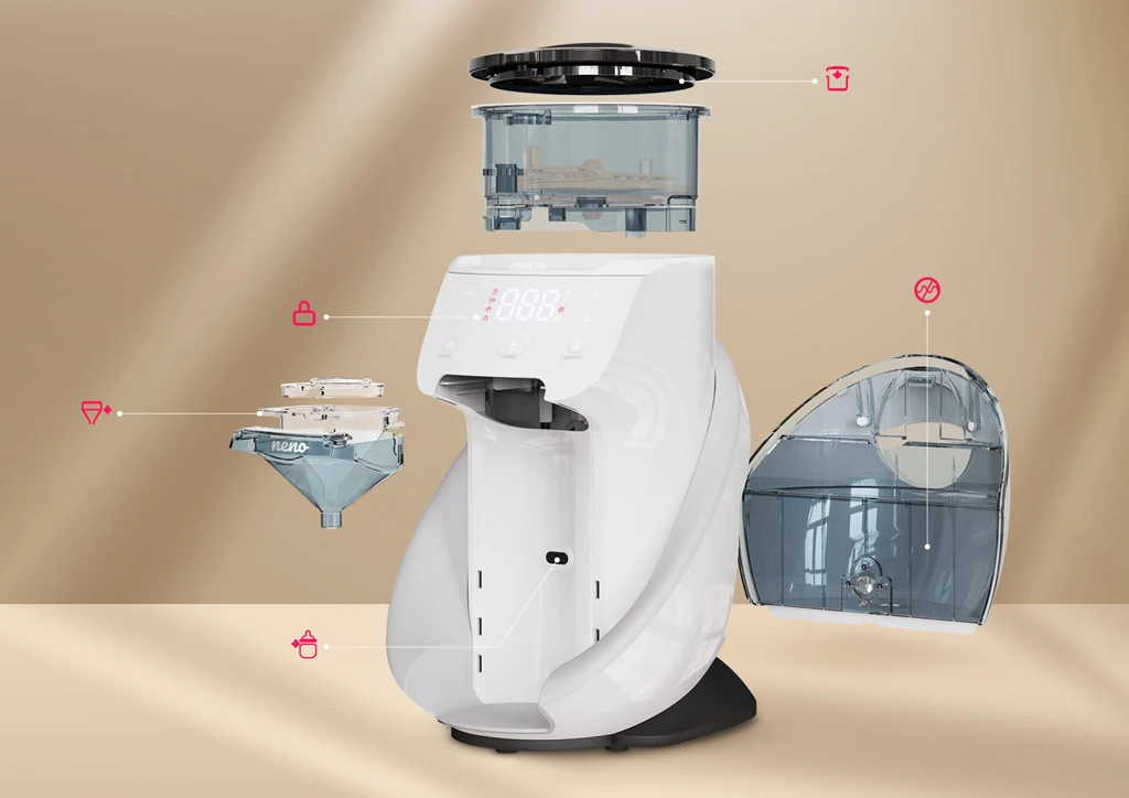 - Automatické miešanie mlieka: Neno Primavera automaticky mieša mlieko a vodu, čo zaručuje dokonalú konzistenciu bez vzduchových bublín. Vyberte si program podľa druhu mlieka a prístroj sa postará o správnu koncentráciu a mix.