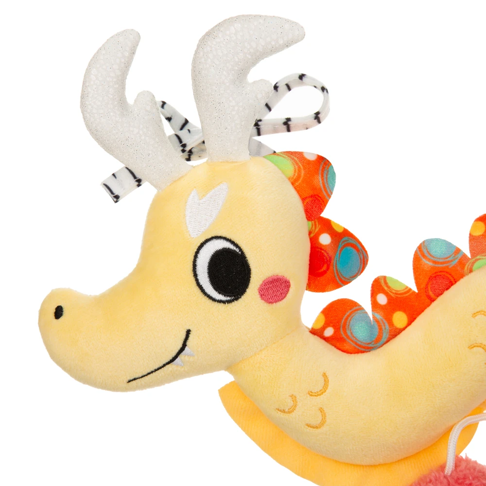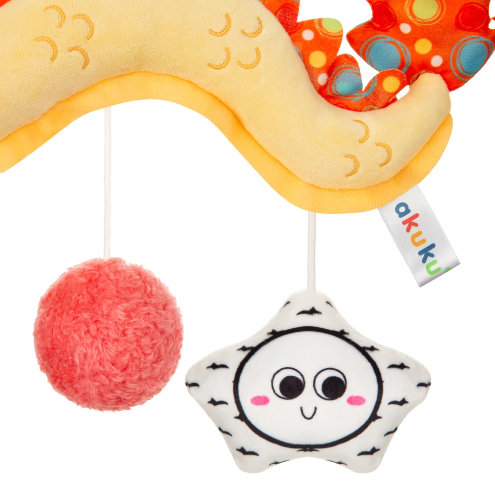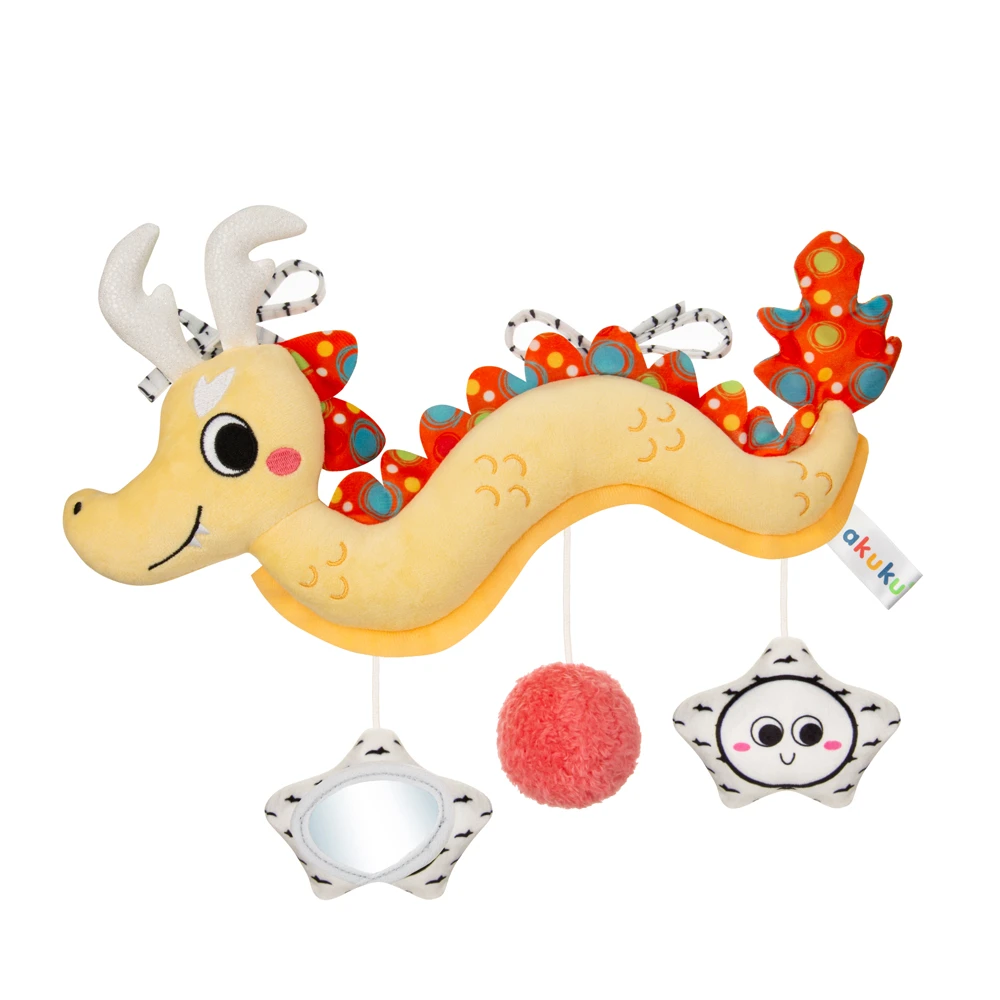 Farebný dráčik od značky Akuku je senzorická hračka navrhnutá špeciálne pre najmenších. Kombinuje jemné materiály, hravé farby a rôzne textúry, ktoré stimulujú detské zmysly a podporujú rozvoj motoriky. Mäkké telo dráčika je doplnené o hrkálku v tvare brmbolca a zrkadlo v tvare hviezdičky, ktoré prirodzene priťahujú pozornosť dieťaťa a podporujú jeho zvedavosť. Vďaka praktickým stužkám je možné hračku ľahko zavesiť na kočík, postieľku alebo hrazdičku, takže môže sprevádzať bábätko pri každom dobrodružstve.