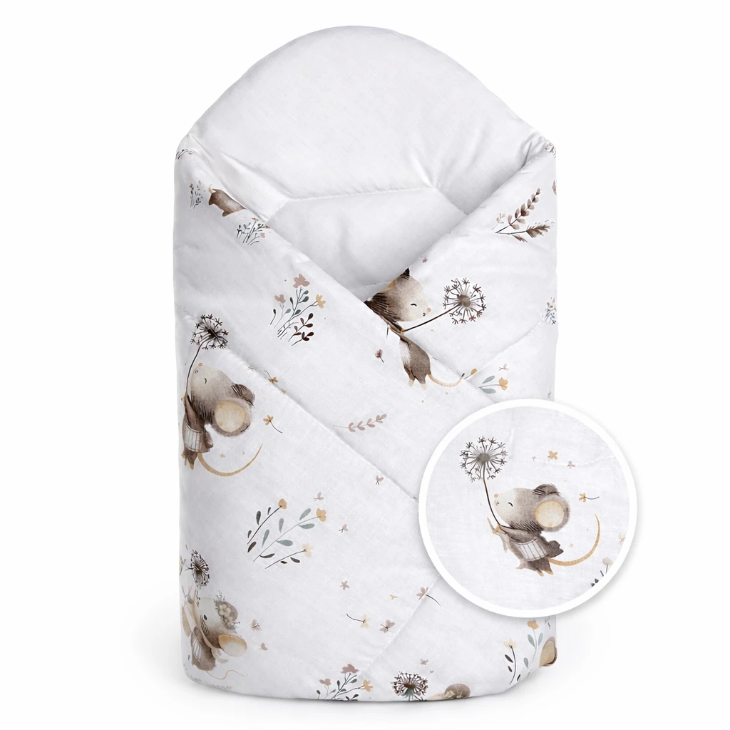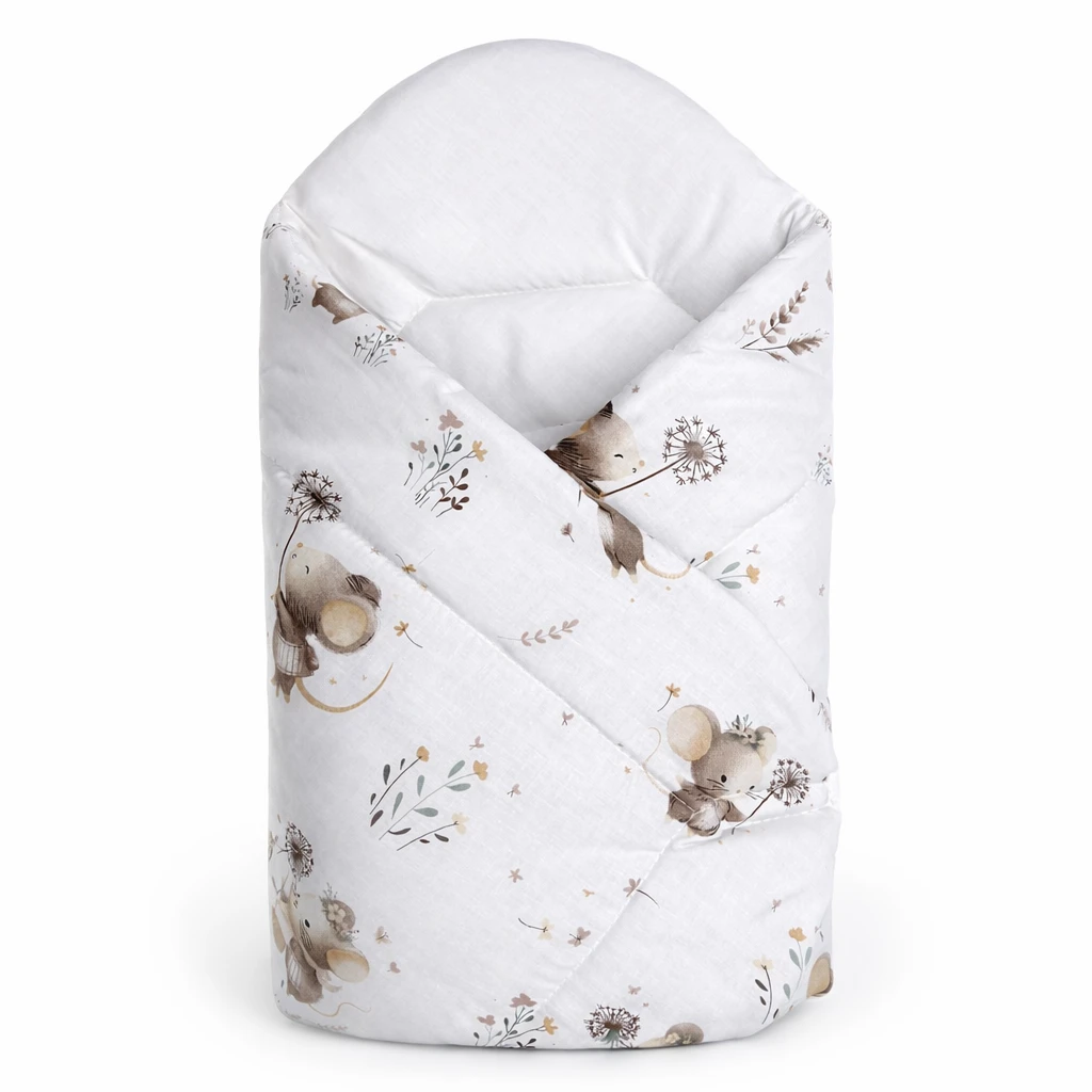 Rozmer cca 80 × 75 cm je ideálny na pohodlné zavinutie bábätka. Povrch je vyrobený z kvalitnej 100% bavlny, ktorá je jemná a šetrná k citlivej detskej pokožke. Vnútorná výplň z hypoalergénneho dutého vlákna zaisťuje maximálny komfort, tepelnú pohodu a bezpečné používanie.