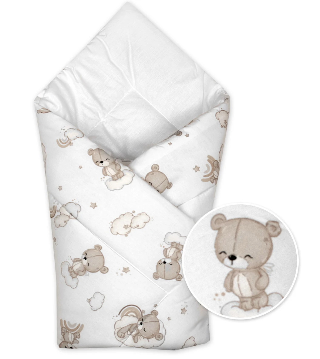 Rozmer cca 80 × 75 cm je ideálny na pohodlné zavinutie bábätka. Povrch je vyrobený z kvalitnej 100% bavlny, ktorá je jemná a šetrná k citlivej detskej pokožke. Vnútorná výplň z hypoalergénneho dutého vlákna zaisťuje maximálny komfort, tepelnú pohodu a bezpečné používanie.