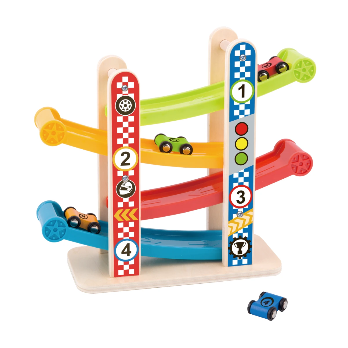 - Obsahuje 4 farebné autíčka, ktoré sa deti učia spúšťať dole po svahu - jednoduchý mechanizmus, veľká radosť.