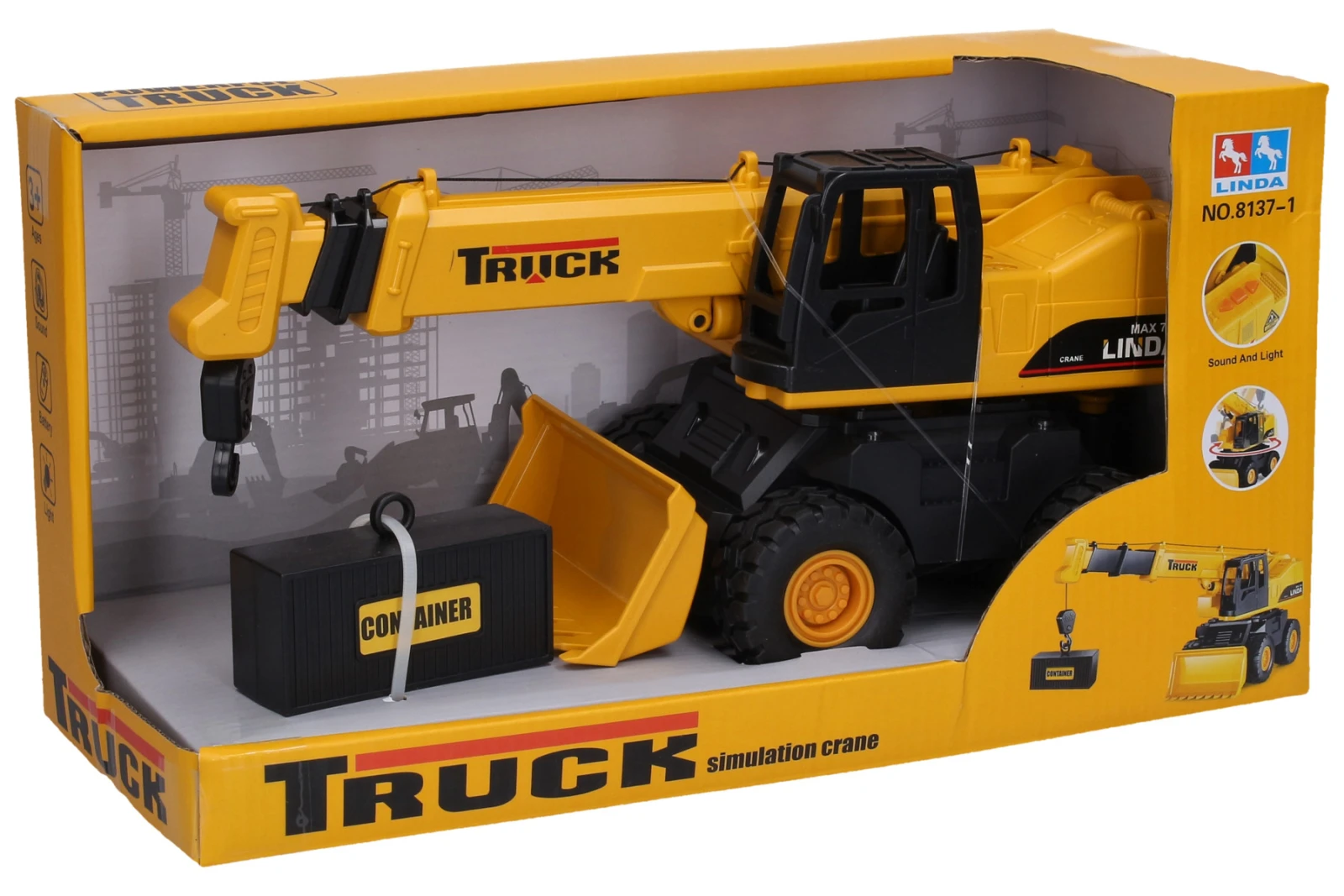 Balenie obsahuje žeriav a kontajner 8,5 cm. Vydáva zvukové efekty, aktivácia tlačidlami na streche.