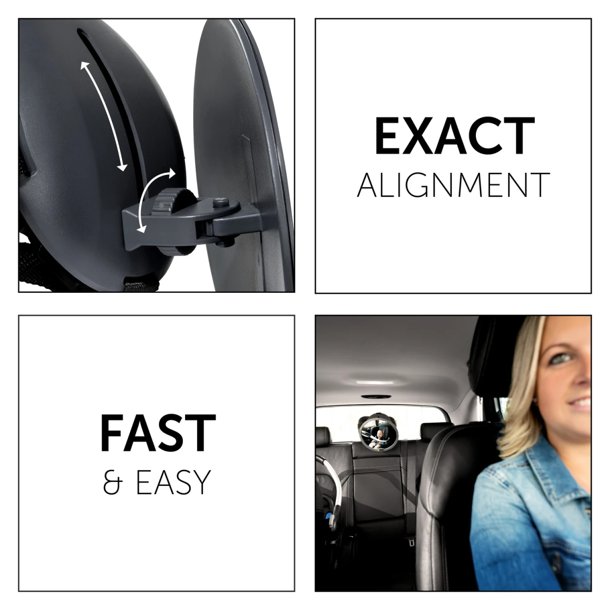 S týmto zrkadlom budete mať vaše dieťa v autosedačke smerujúcej proti smeru jazdy alebo vo vajíčku, vždy na dohľad. Zrkadlo sa umiestni na opierku hlavy sedadla automobilu. Nemusíte sa tak pri riadení vozidla zakaždým otáčať za dieťaťom, ale stačí len pohľad do spätného zrkadla a razom zistíte, či je všetko v poriadku. Týmto spôsobom zaistíte bezpečnosť nielen dieťaťu, ale aj celej posádke vozidla. Zrkadlo sa dá bezpečne a pevne prichytiť pomocou štyroch pásikov na každú opierku hlavy, a to ako v horizontálnom, tak vo vertikálnom smere podľa potreby. Veľké zorné pole Vám vždy zaistí dostatok výhľadu a kvalitné, materiál odolný proti zlomu znižuje riziko poranenia.