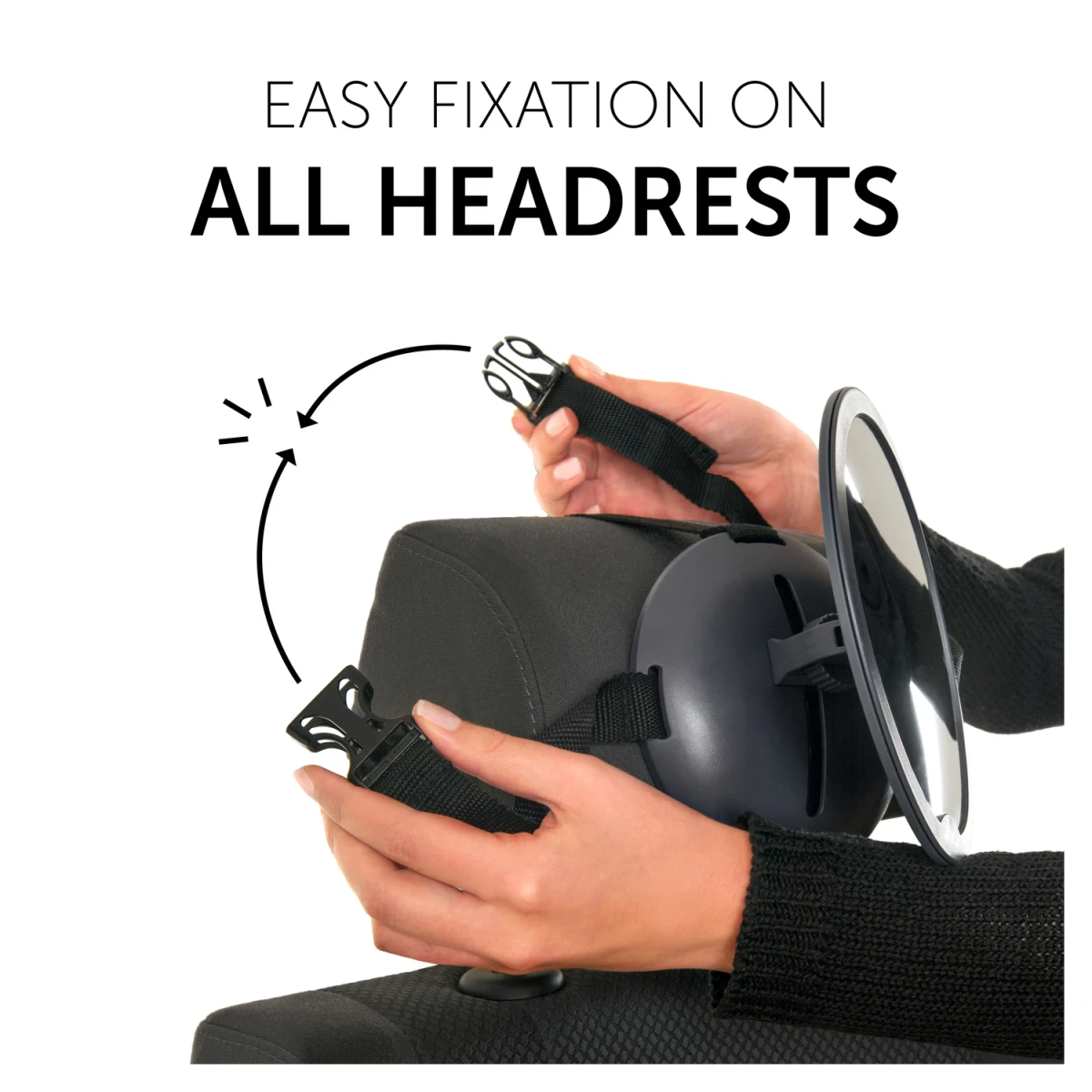 Zrkadlo sa dá bezpečne a pevne prichytiť pomocou štyroch pásikov na každú opierku hlavy sedadla, a to ako v horizontálnej, tak vo vertikálnej polohe podľa potreby. Veľké zorné pole vám vždy zaistí dostatok výhľadu a kvalitný, nerozbitný materiál znižuje riziko poranenia.