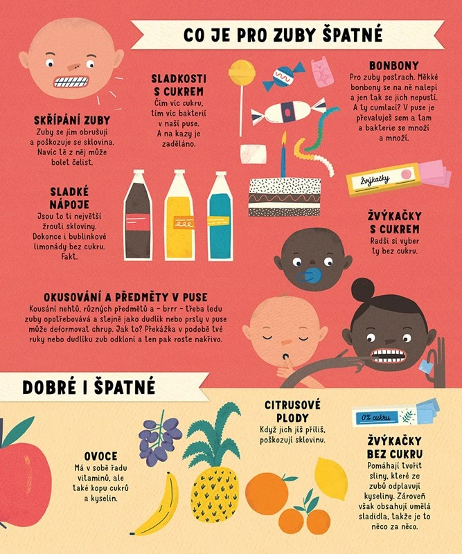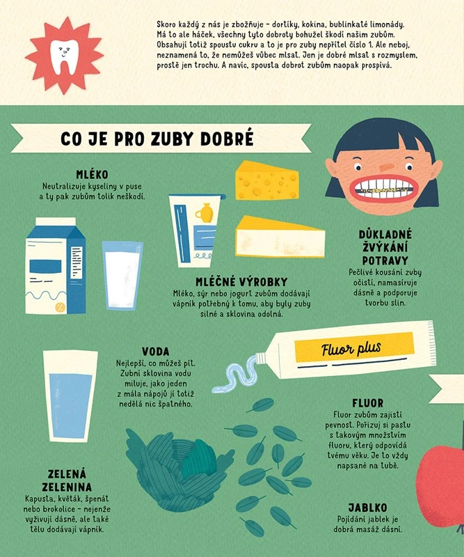 Text je napísaný s ľahkosťou a humorom , takže deti baví a zároveň vzdeláva. Farebné a vtipné ilustrácie pomáhajú lepšie pochopiť, ako zuby fungujú, a nechýbajú ani zábavné otázky a prekvapivé zaujímavosti – napríklad ako by človek vyzeral, keby mal zuby ako netopier.